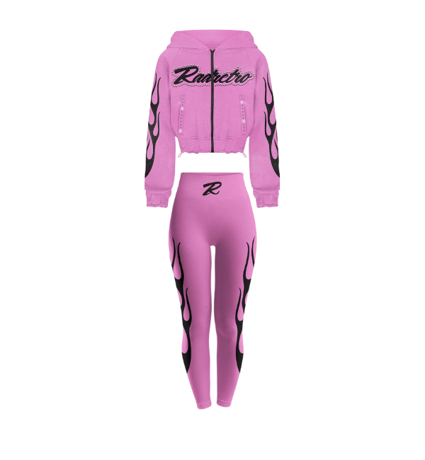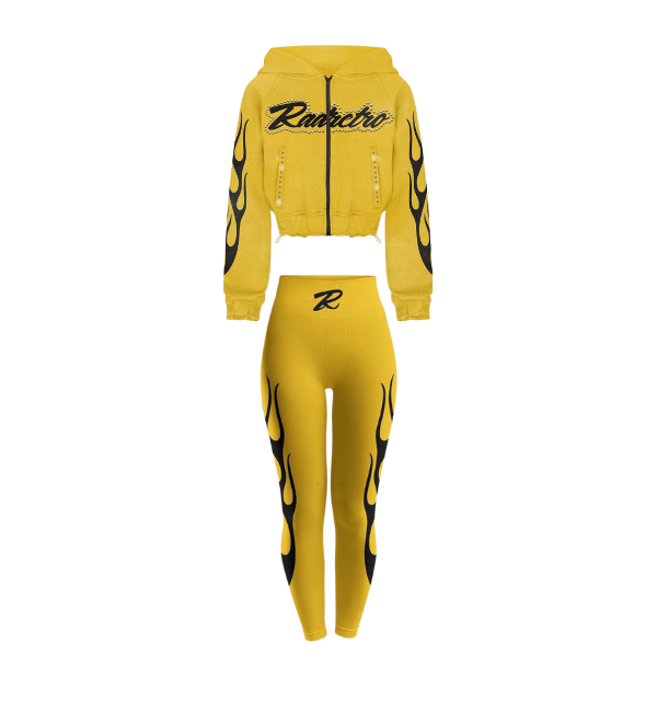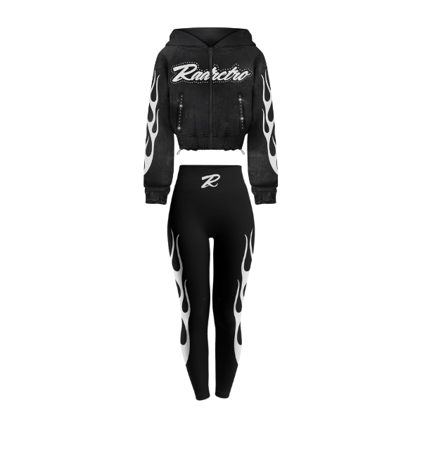 Ignite your wardrobe with the Infernal Velocity Set, a blazing three-piece ensemble that captures the raw, high-energy style of the street and the racetrack. This fierce set is perfect for making a bold, unapologetic statement. The ensemble features: 1. Cropped Zip-Up Hoodie: Crafted from a dark wash denim or durable fabric, this cropped hoodie is the centerpiece of the look. It is emblazoned with the iconic RADRETRO script and features dramatic white-on-black flame graphics extending from the shoulders and sleeves. It has an adjustable hood, a silver zip-up front, and a cropped fit that perfectly complements the high-waisted bottoms. 2. Matching Fitted Crop Tee: A simple yet essential black crop top provides a sleek base layer, featuring the RADRETRO logo in crisp white across the chest. It's the perfect pairing for the hoodie on cooler days or a minimalist statement on its own. 3. High-Waisted Flame Leggings: These performance-ready leggings feature a high, supportive waist and an incredibly bold design. The white flame graphic sweeps dramatically up the front and back of the legs, creating a powerful, dynamic visual effect that makes your legs look miles long. The leggings are finished with the signature 'R' logo on the waistline. Designed for those who live life in the fast lane, this set brings Y2K and racing aesthetics together for a look that is both hot and undeniably cool.