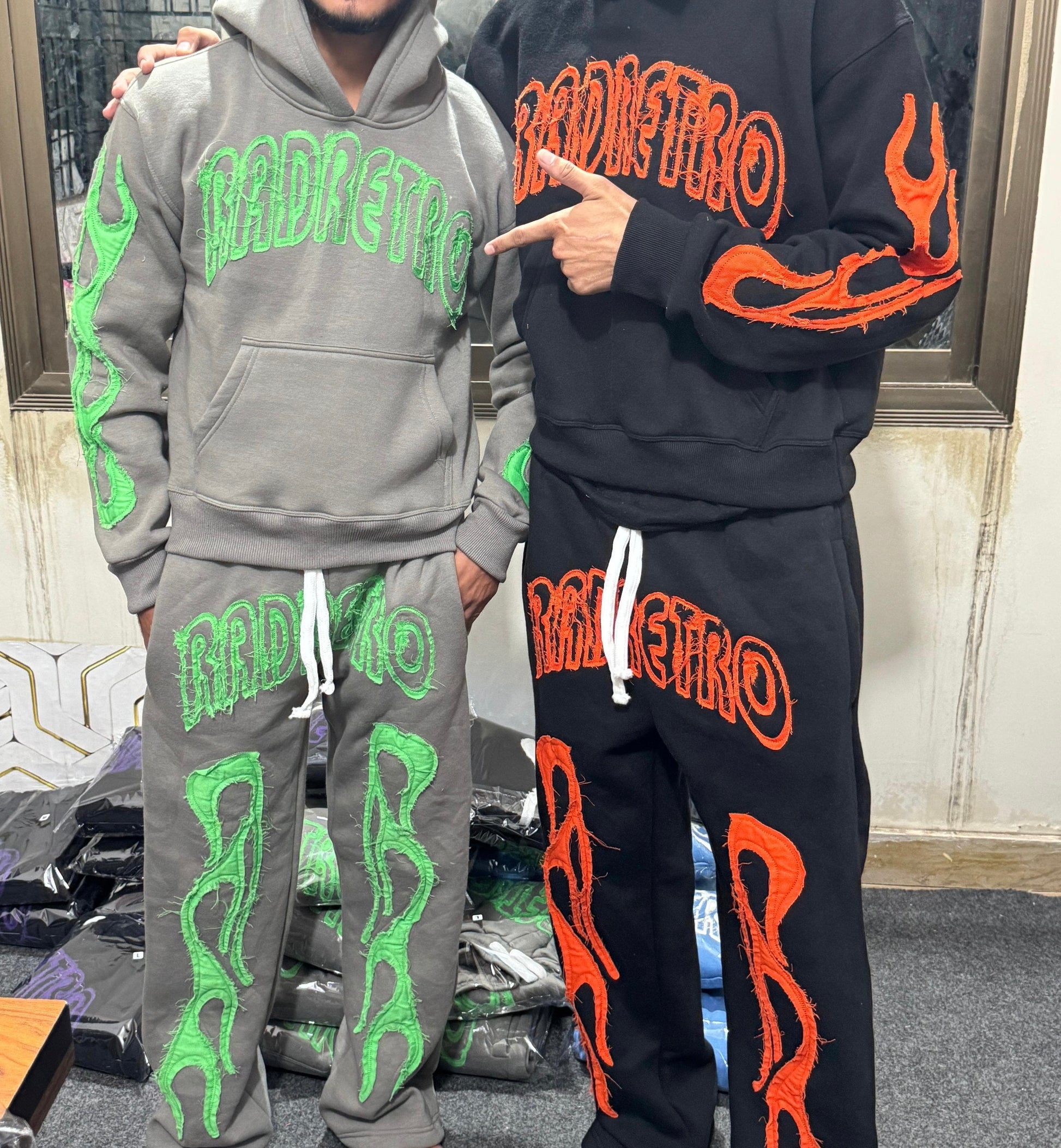The "Inferno Glitch" Rhinestone Tracksuit Ignite your style with the "Inferno Glitch" Rhinestone Tracksuit. This black set merges bold street aesthetics with dazzling, high-impact details, ensuring you stand out day or night. It’s an instant head-turner for those who aren't afraid to let their fashion speak loudly. Design Highlights: • Dazzling Centerpiece: The front of the hoodie features a large, custom wordmark (appears to read "Inferno" or similar) crafted from brilliant, heat-set rhinestones. This distressed, 'glitched' graphic provides incredible sparkle against the deep black fabric. • Flame Detailing: Both the hoodie sleeves and the matching sweatpants are accented with dramatic, distressed white flame appliqués. These frayed, stylized flames give the set an authentic, worn-in edge and dynamic movement. • Comfort & Edge: Made from a soft, premium black cotton blend, this tracksuit doesn't compromise on comfort. The hoodie includes a large kangaroo pocket and an adjustable drawstring hood, while the pants are cut for a modern, relaxed fit. Perfect for making a statement at a concert, hitting the town, or simply elevating your everyday look. Material: Premium Cotton Blend with Heat-Set Rhinestones